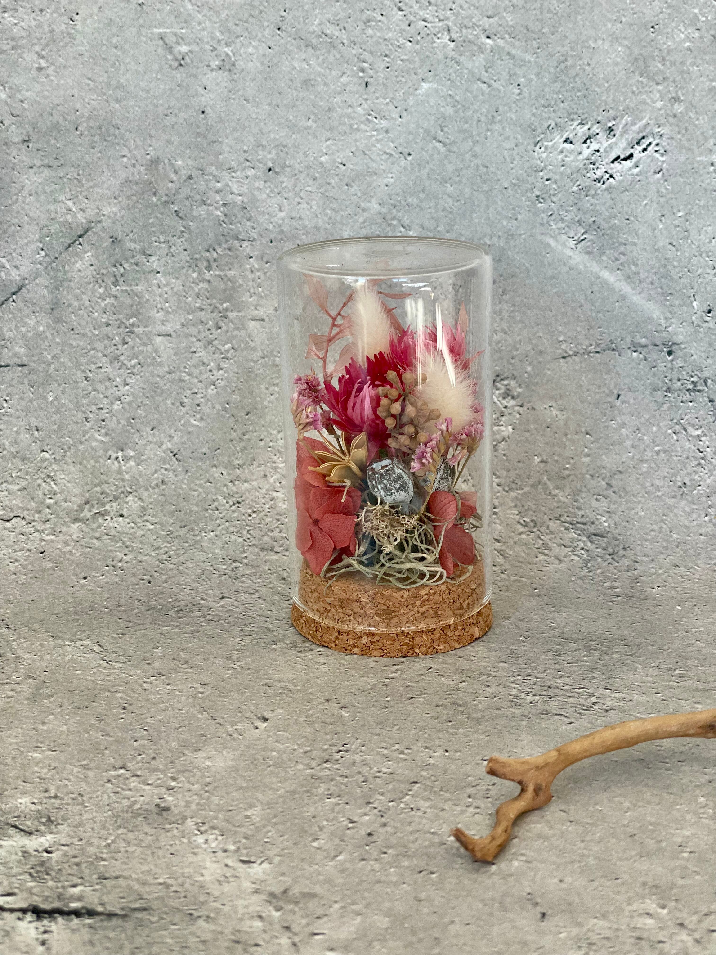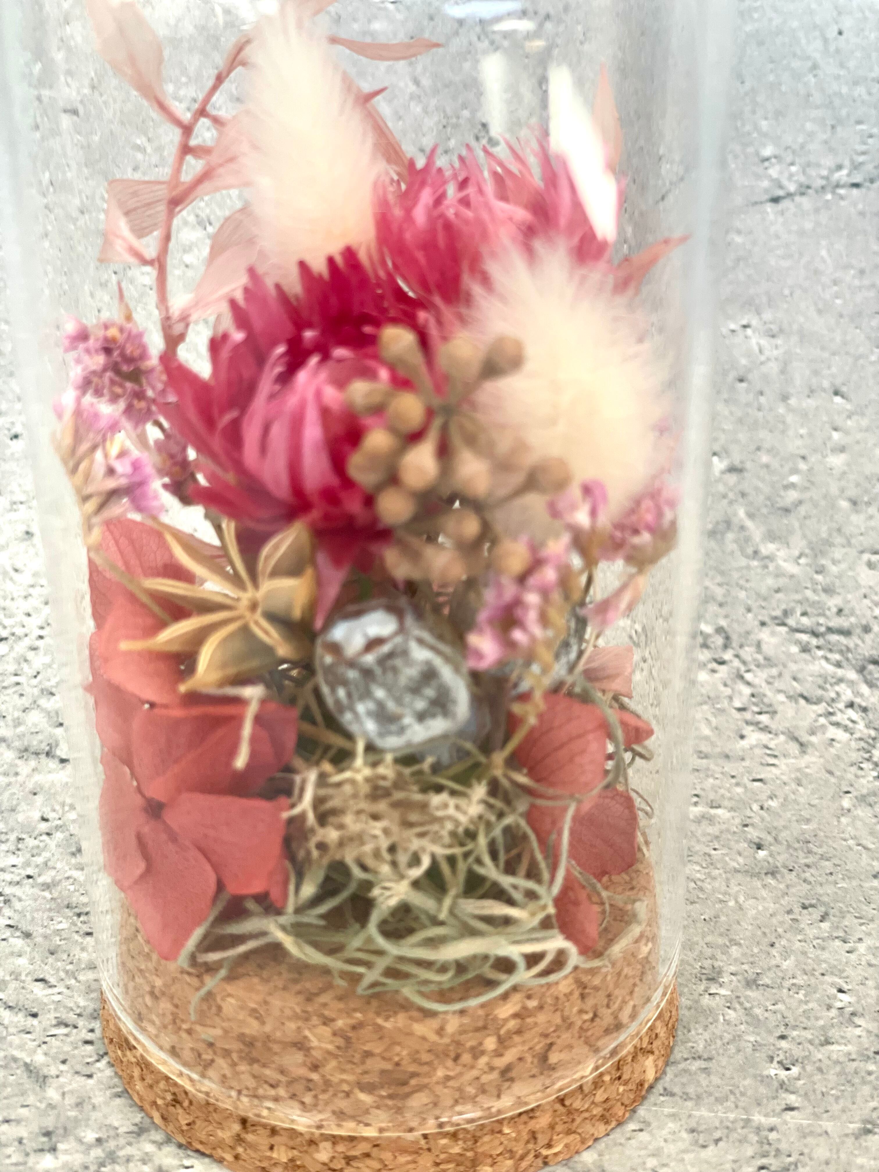 小さなガラスケースの中に入ったアレンジ、濃いピンク系になります。